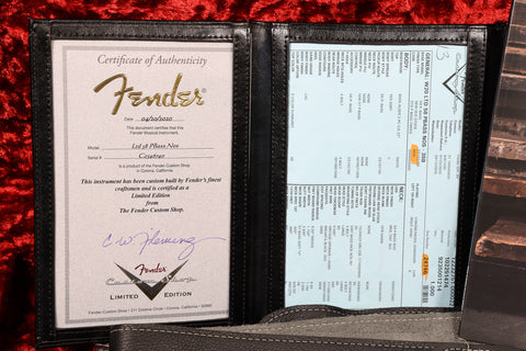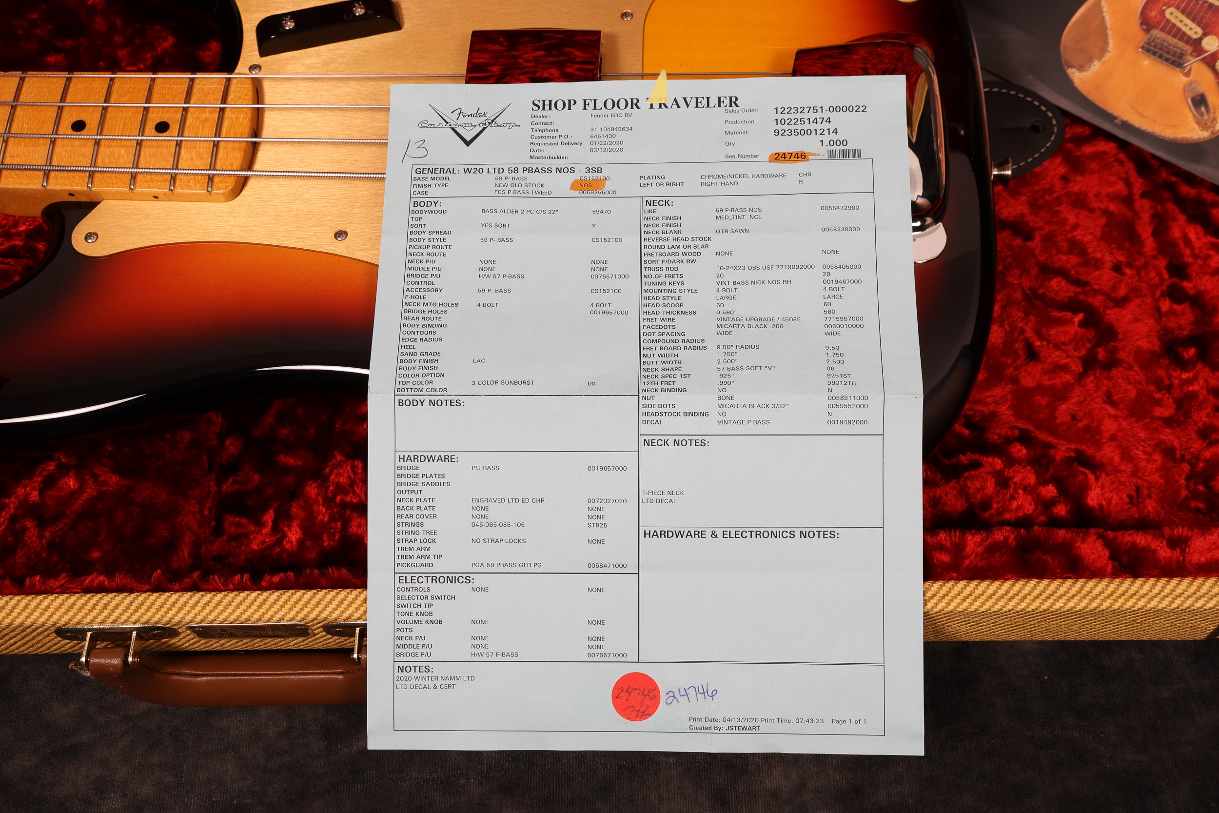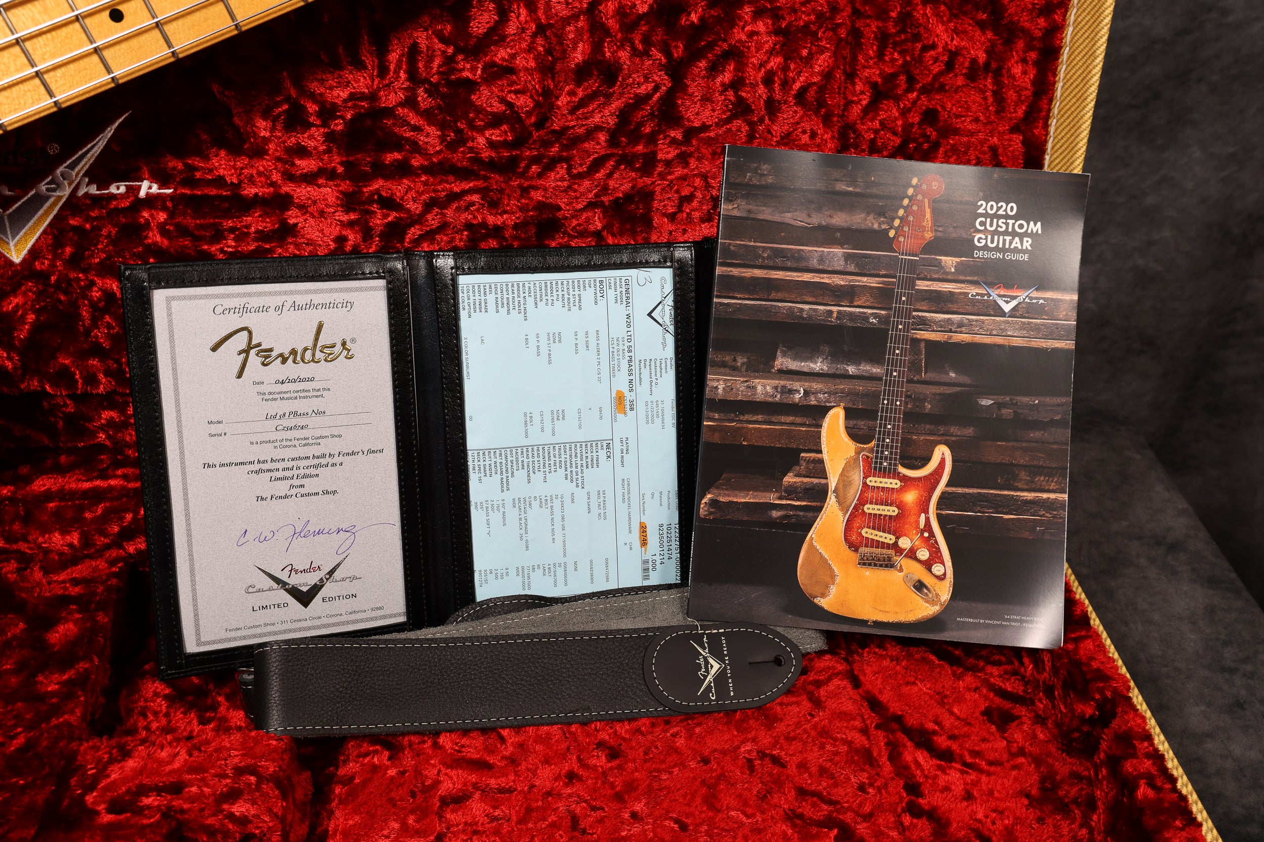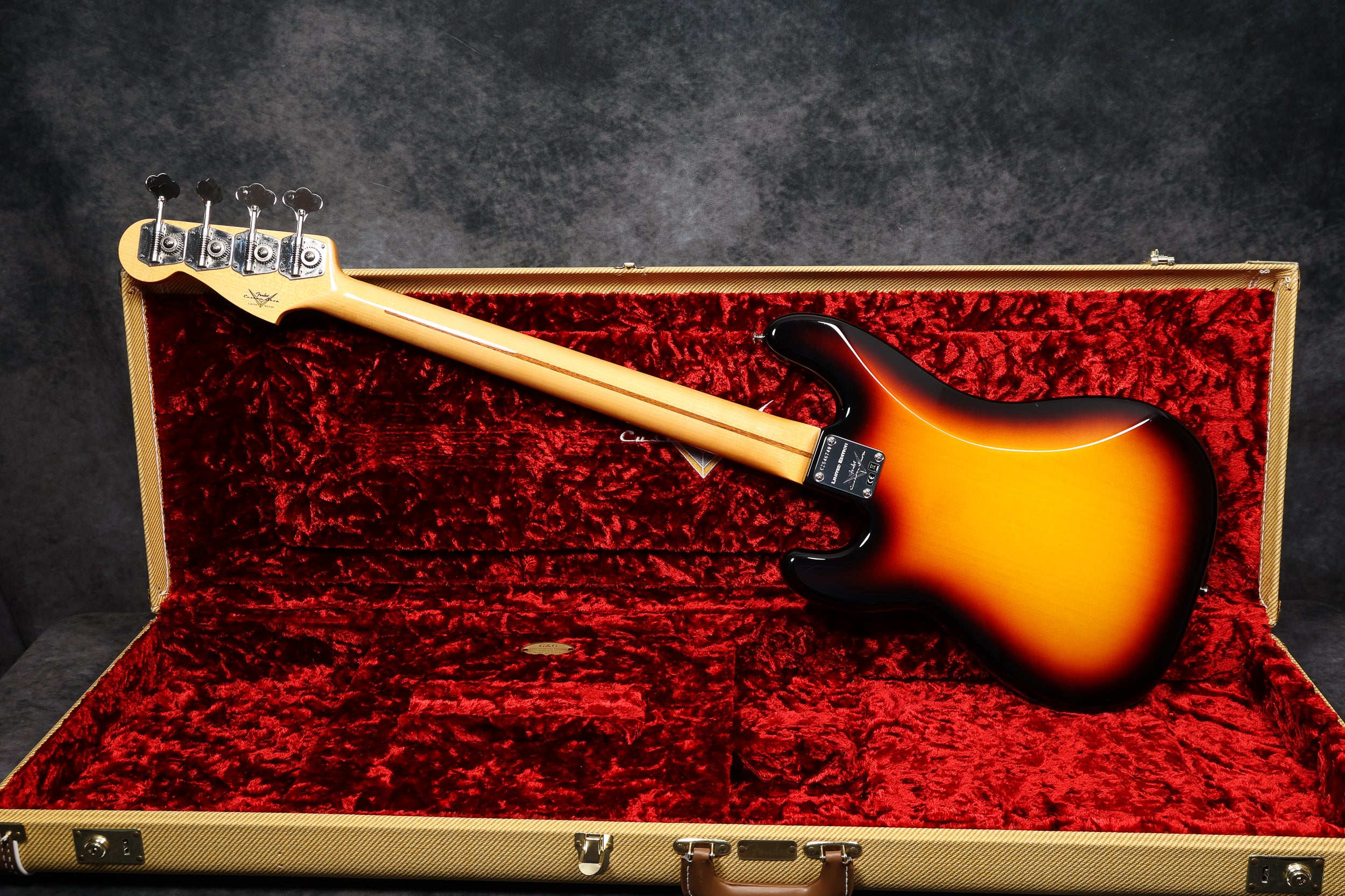 2020 Fender Custom Shop Ltd edition 58 Precision in excellent + condition. Sunburst NOS (New old stock) finish - gold guard, maple neck and fingerboard. Original custom shop tweed case and COA included, as well as the floor traveller, leather strap and brochure.
