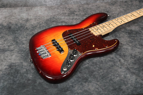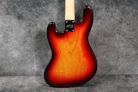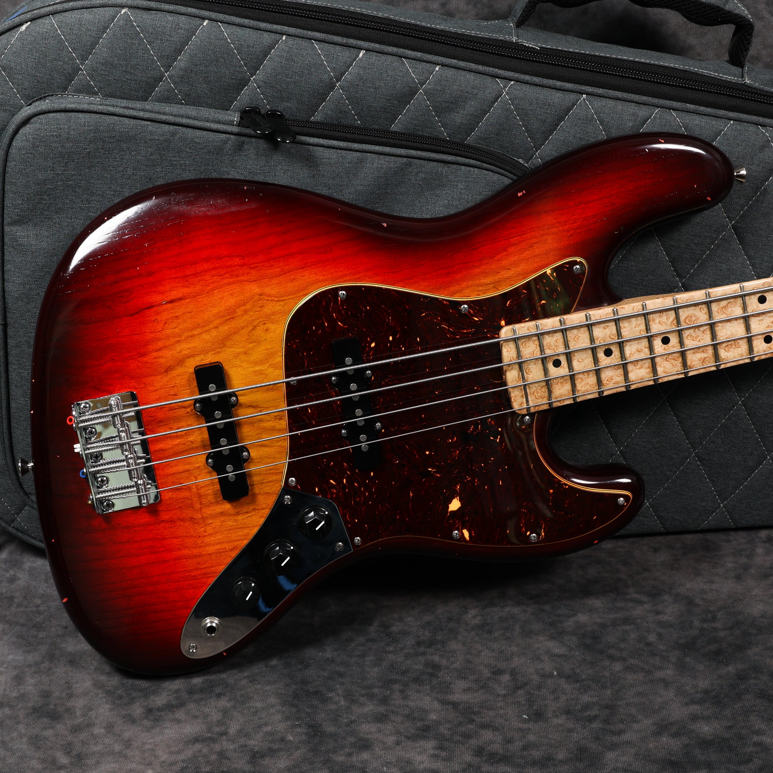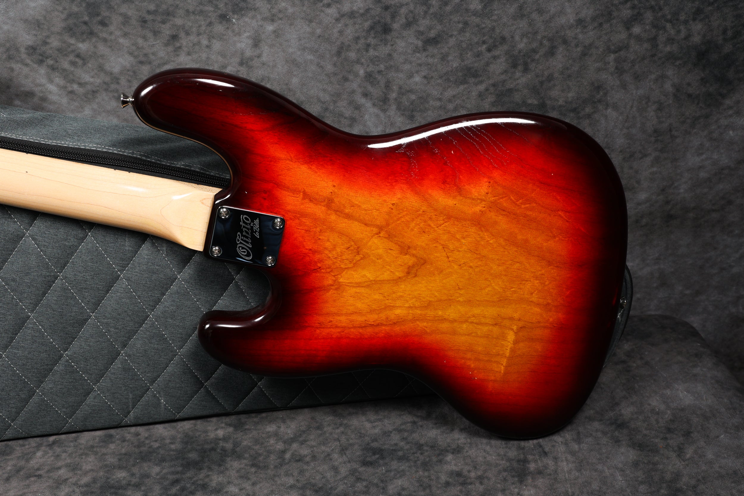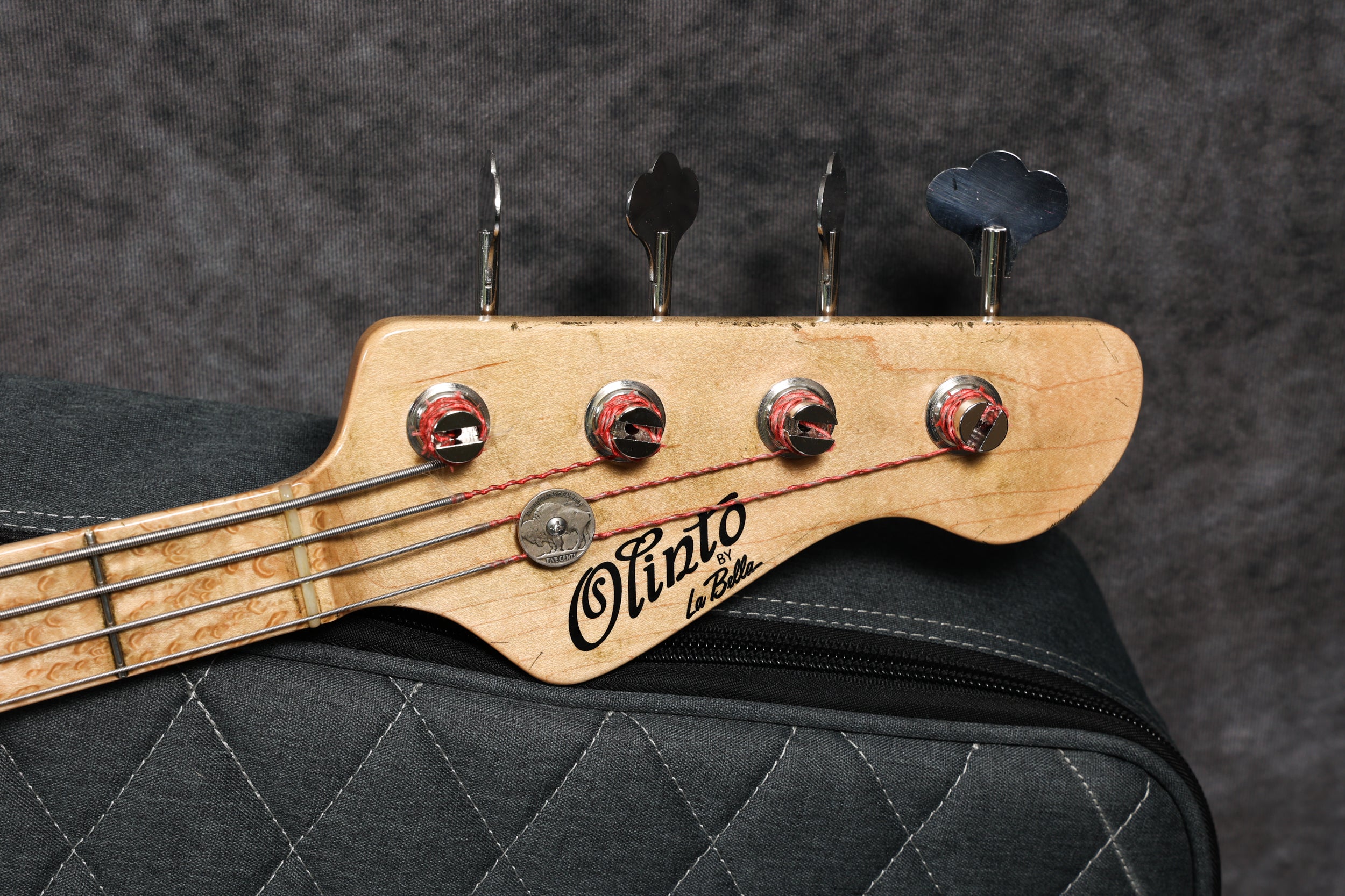 Brand new Olinto 4-String J in Burst Relic. It has a 2-piece ash body, with a maple neck and a stunning AAAA birdseye maple fingerboard, which looks incredible. It's a beautiful bass to play and can be set up with really low action. It was made specially for the NAMM show 2026.