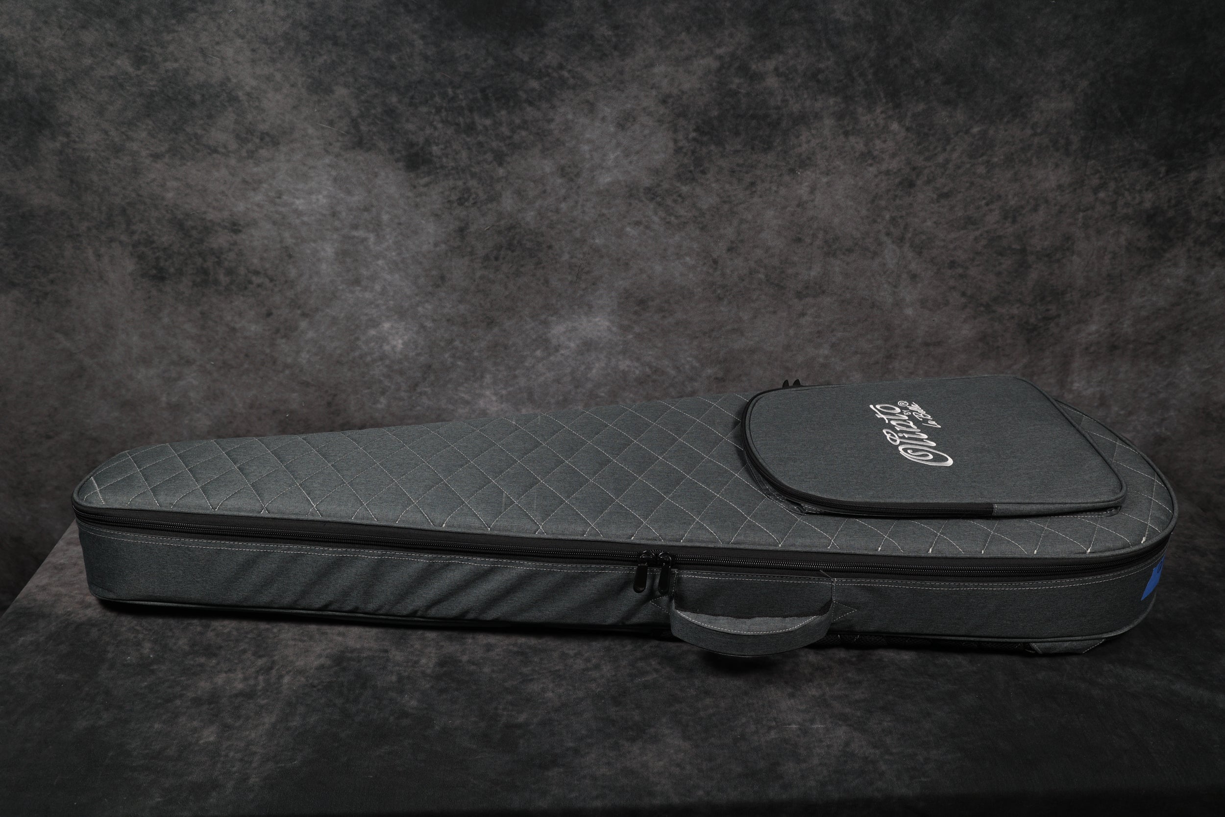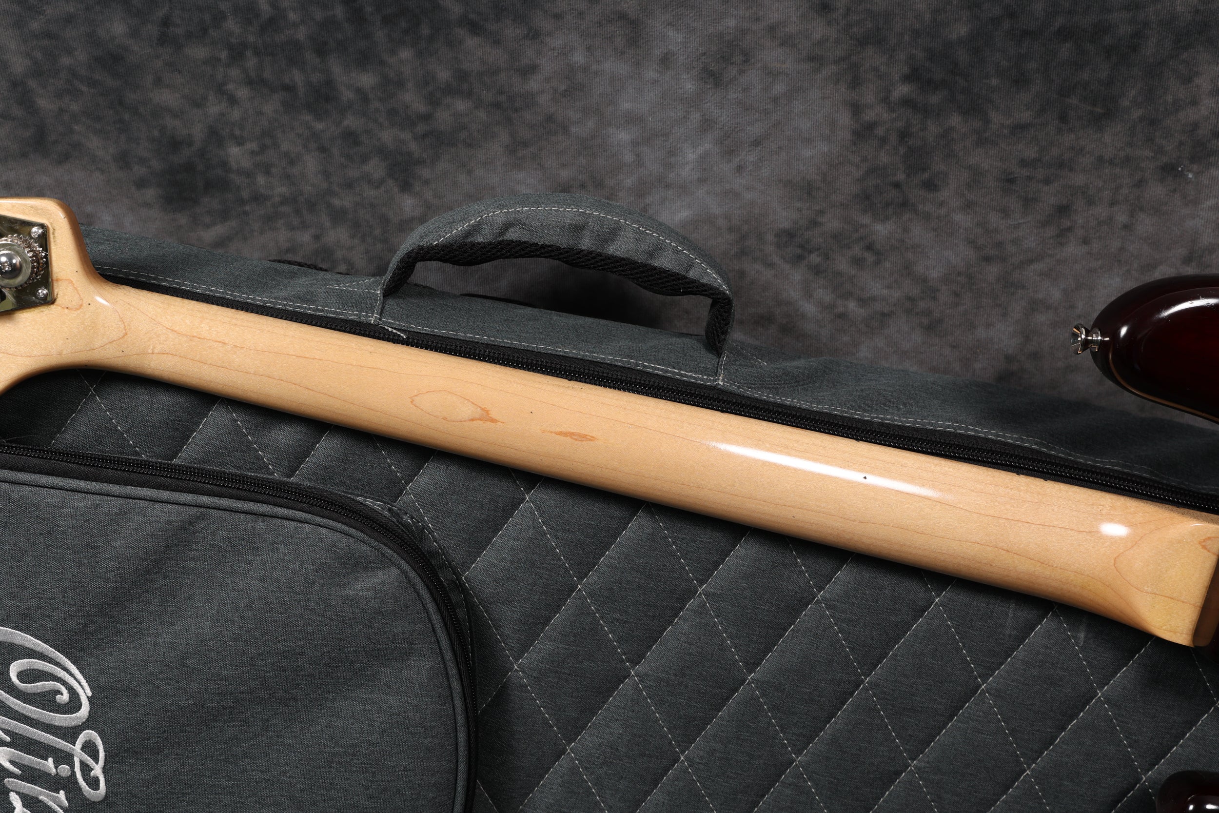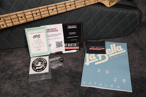 This bass is shipped in an Olinto gig bag and comes with a certificate of authenticity, a La Bella sticker, a pin badge and an Allen wrench, as well as some Andy Baxter Bass merch. It's strung with La Bella ASP-43103 Ian Martin Allison Signature strings.