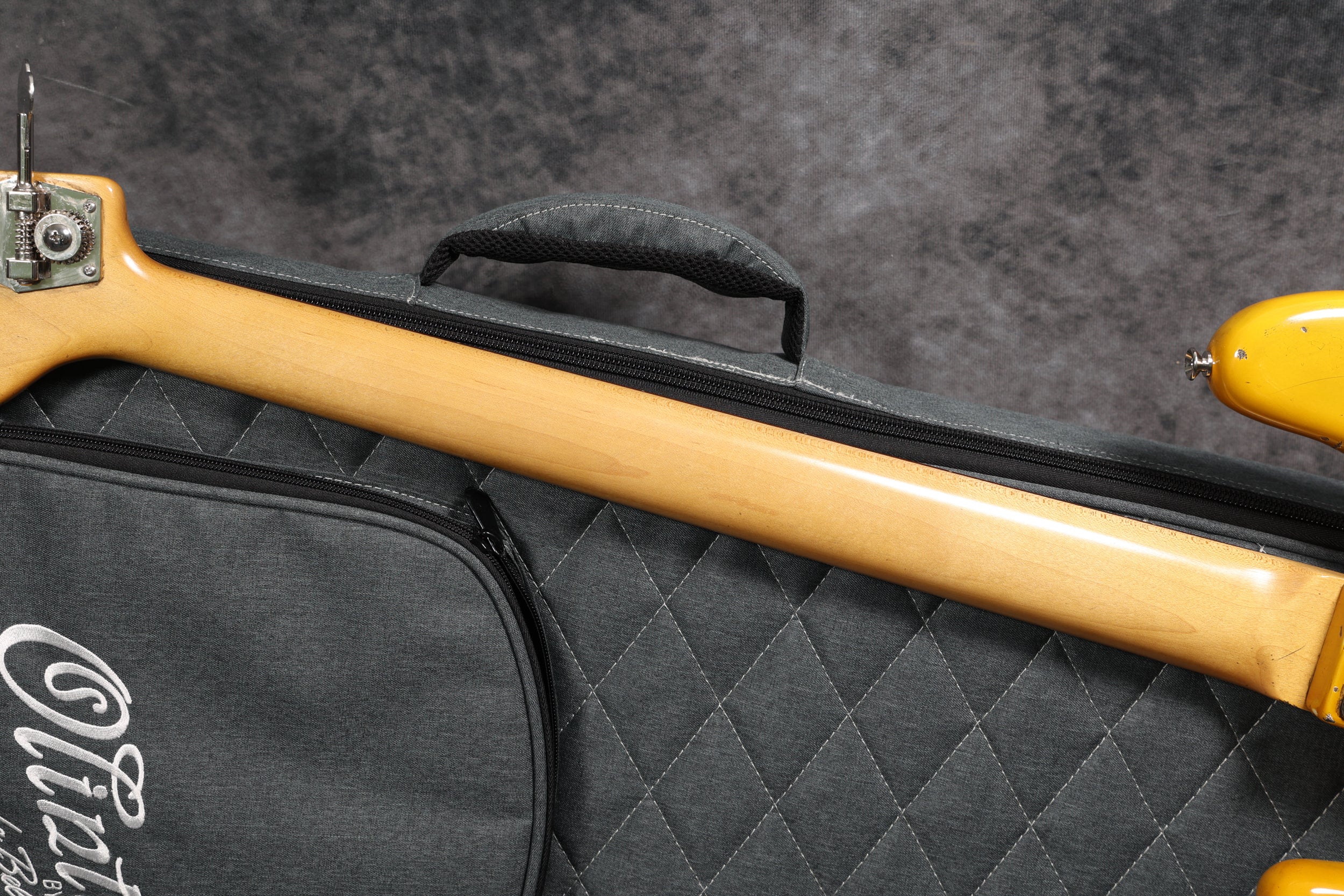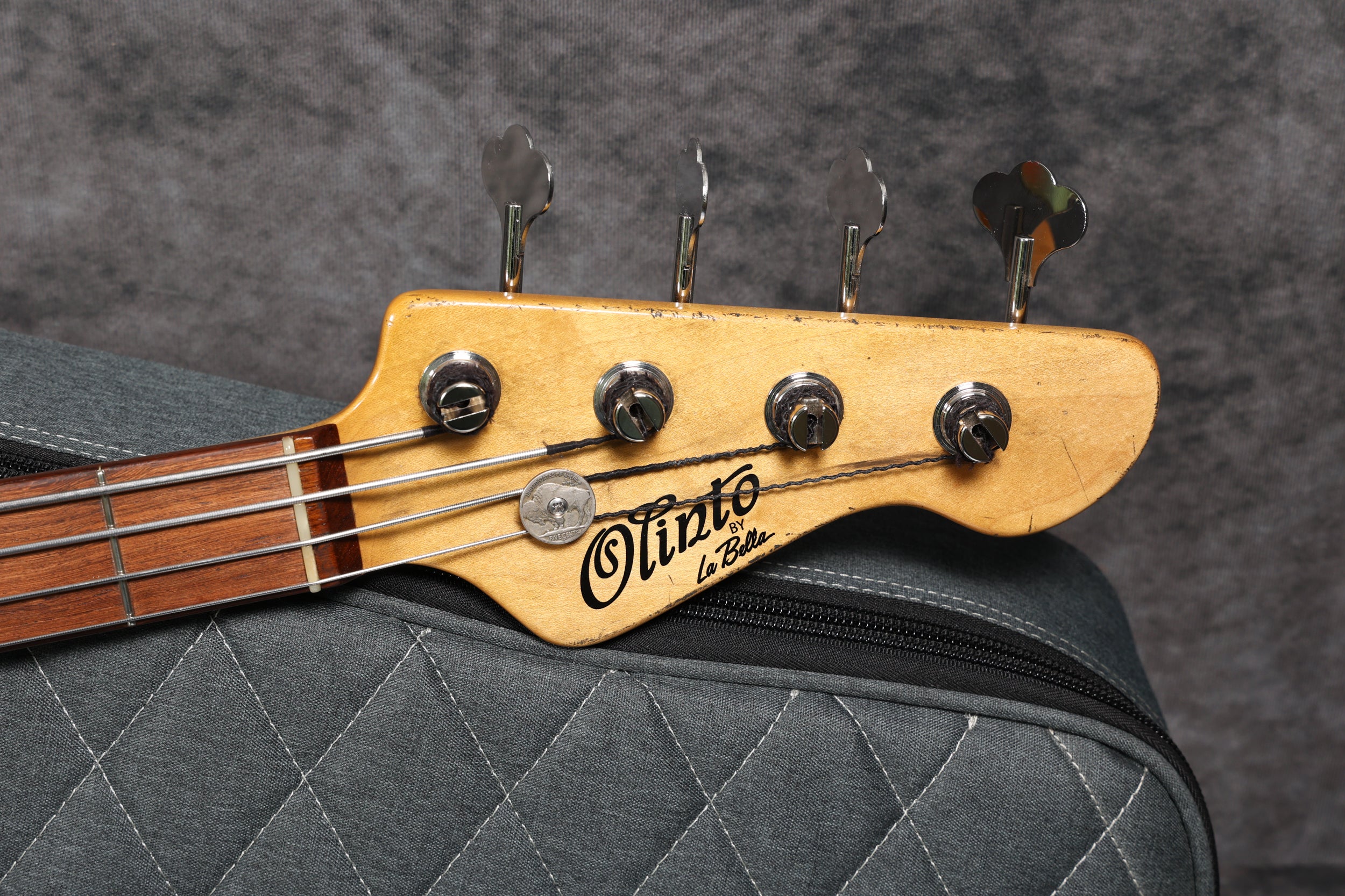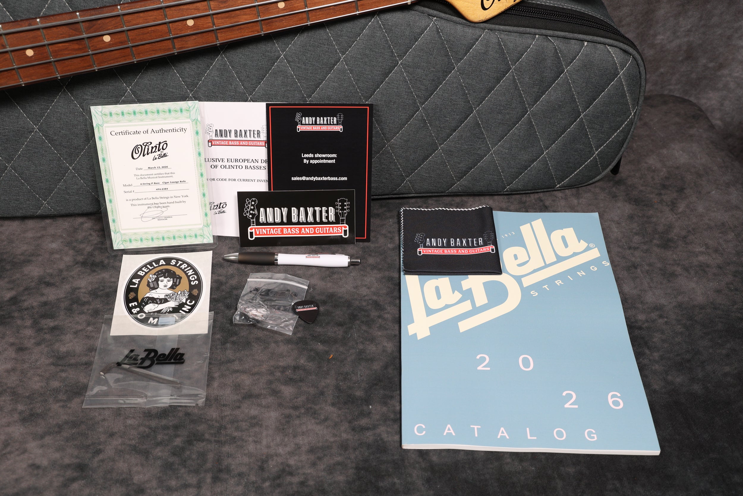 This bass is shipped in an Olinto gig bag and comes with a certificate of authenticity, a La Bella sticker, a pin badge and an Allen wrench, as well as some Andy Baxter Bass merch. It's strung with La Bella OSF-4 Olinto strings.