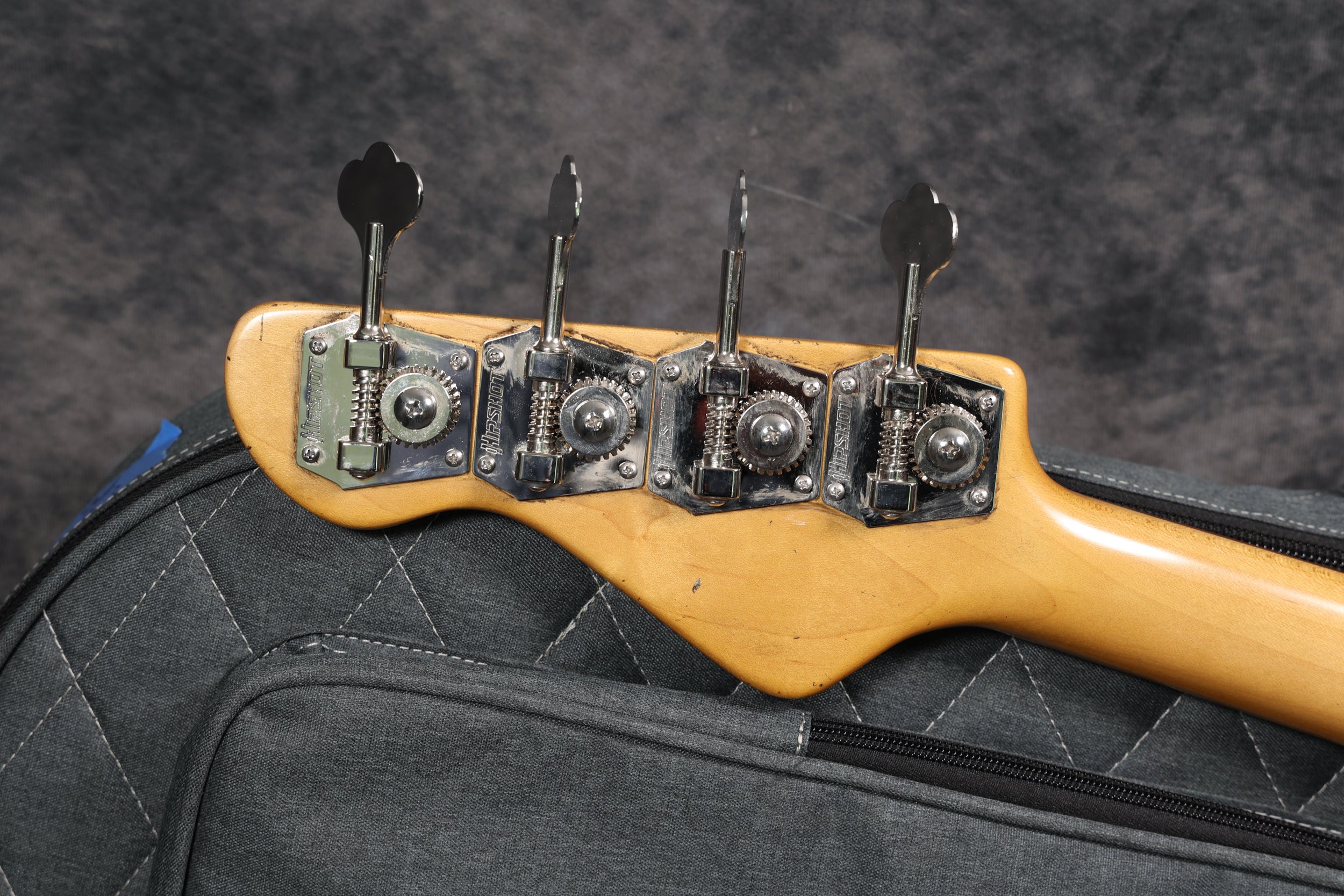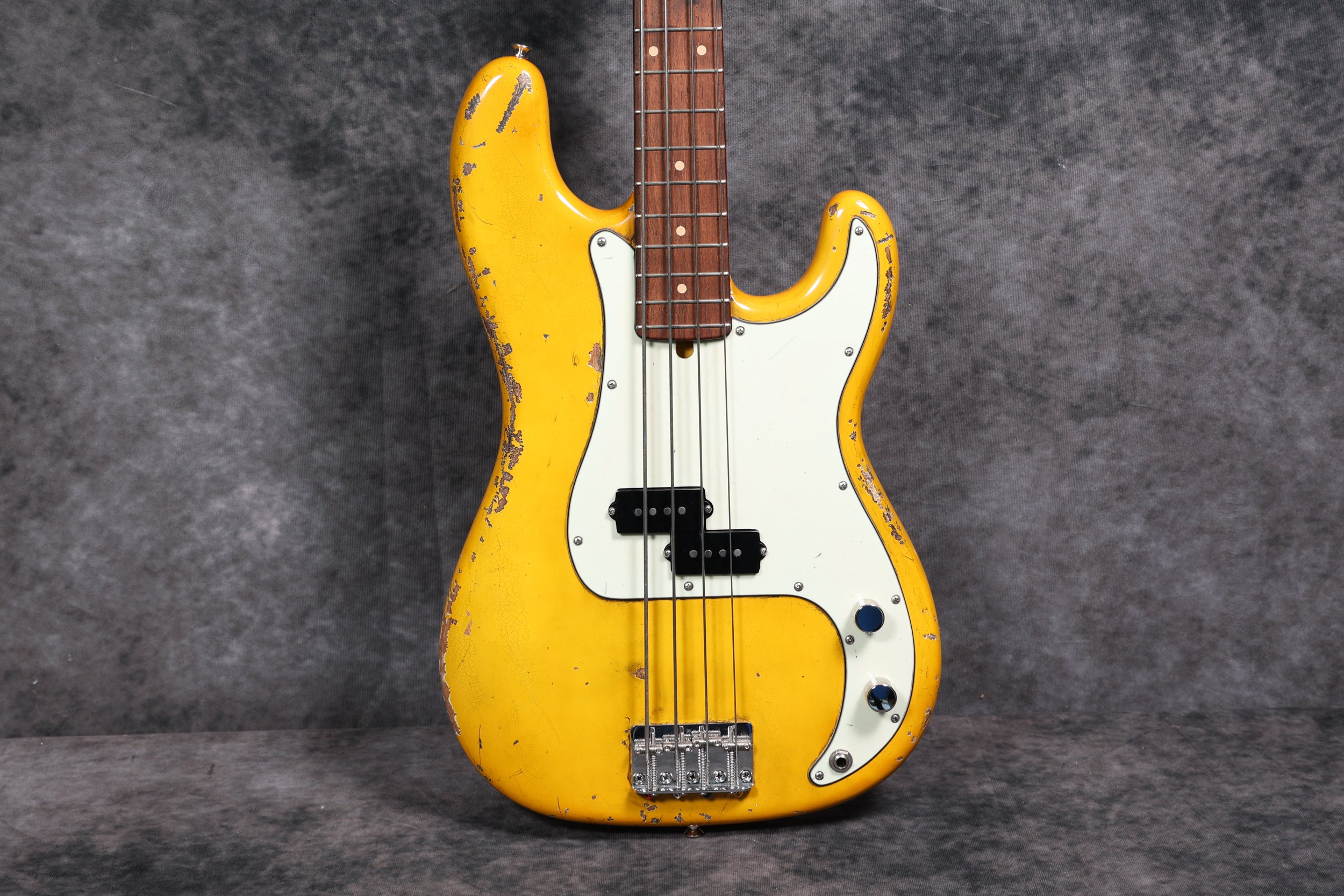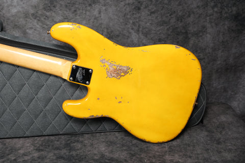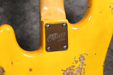 Brand new Olinto 4-String P in Cigar Lounge Relic. It has a 2-piece alder body, with a flat sawn neck and an Indian rosewood fingerboard. This is a great, thumpy P-Bass, and that Cigar Lounge Relic finish looks amazing in person.